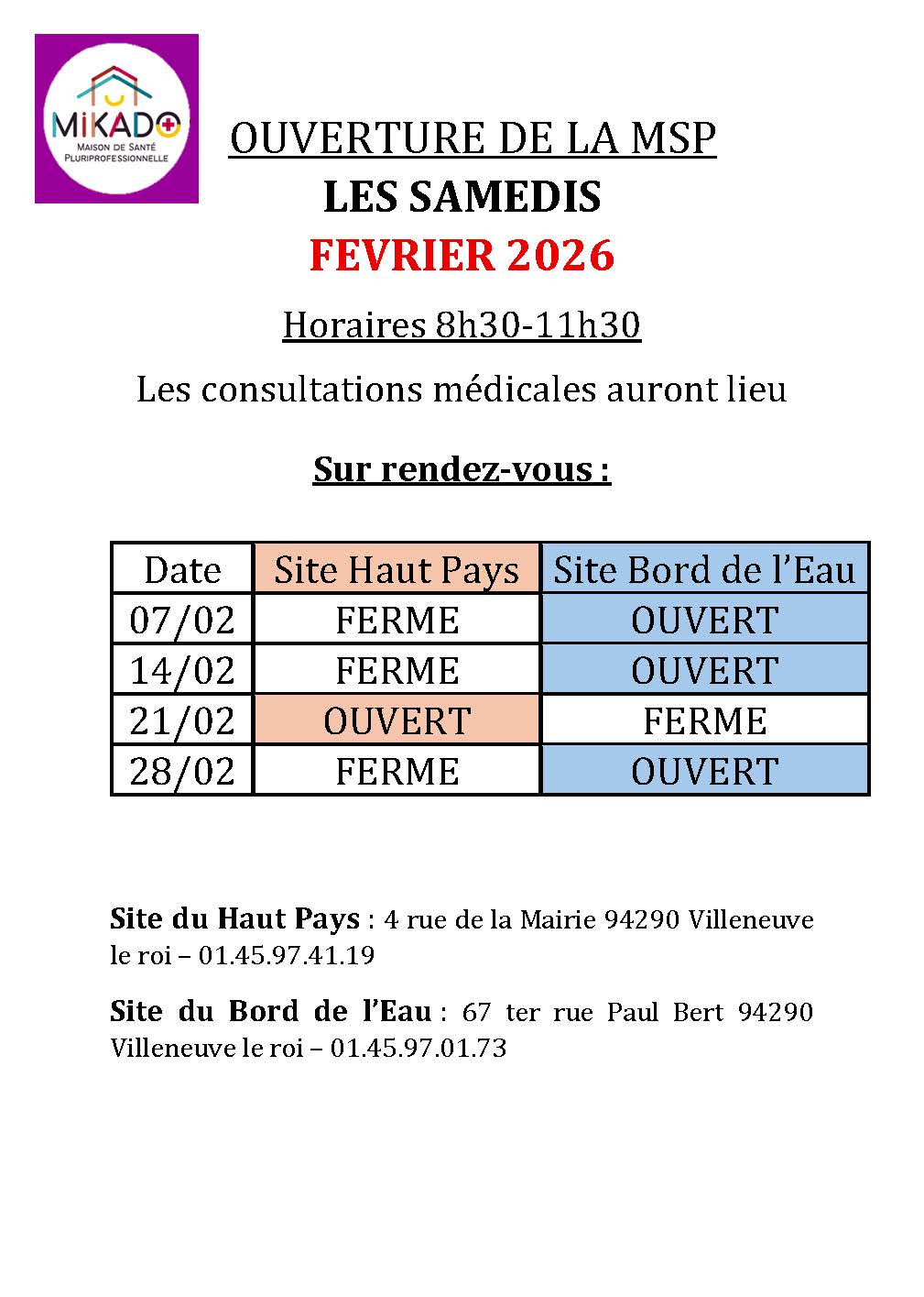 Retrouvez les horaires des consultations médicales du samedi sur le site du Haut Pays et du Bord de l’Eau.